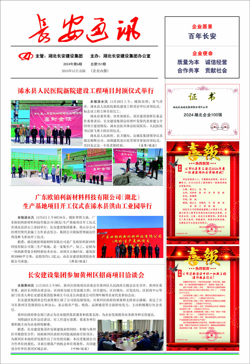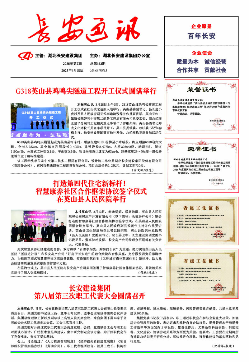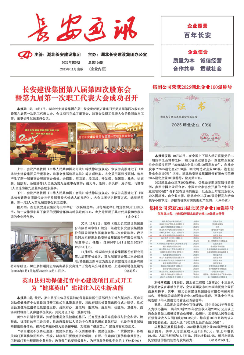• 2025-09-27 湖北長安建設(shè)集團(tuán)股份有限公司 榮獲2025湖北民營企業(yè)100強(qiáng)稱號,位列第35名